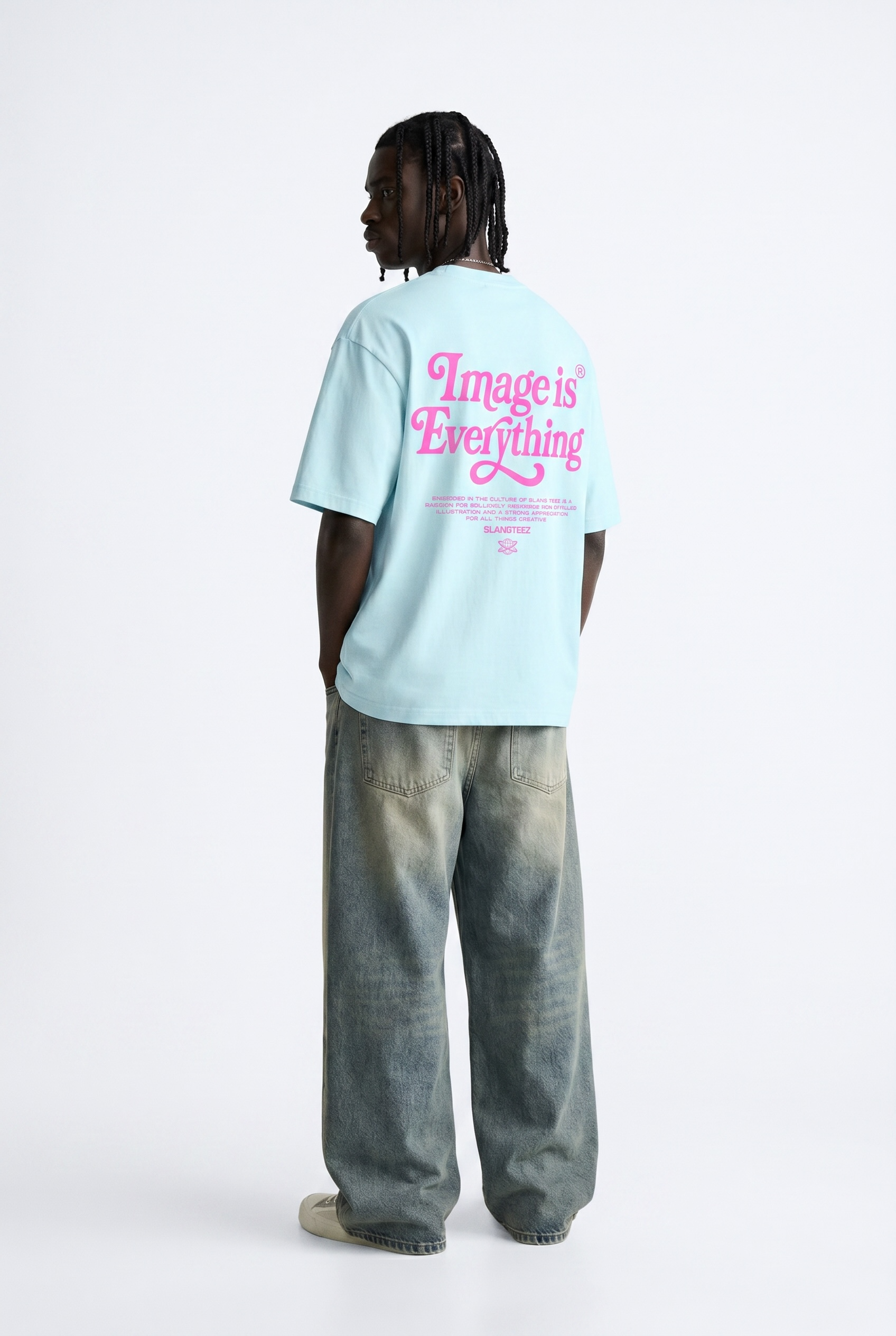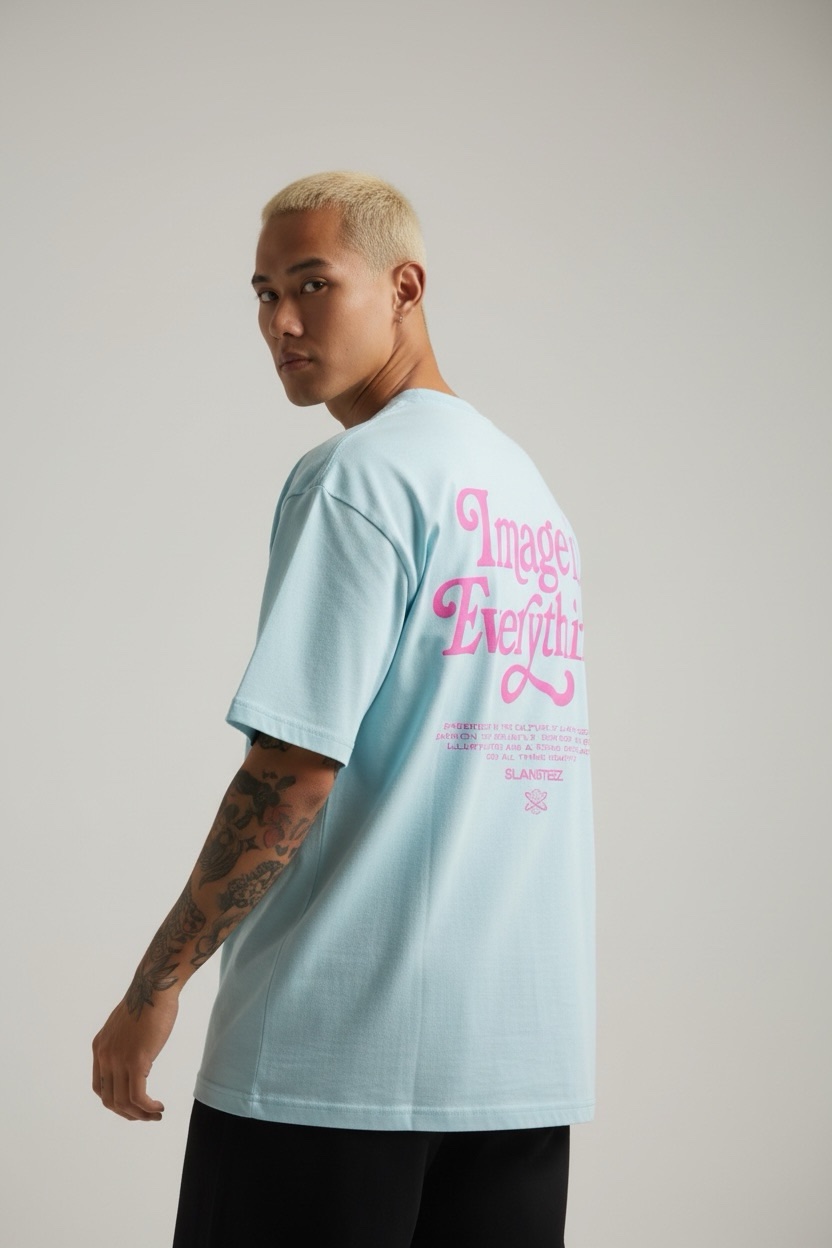 Premium oversized tee in a soft sky-blue tone, featuring bold pink “Image is Everything” typography on the back. Clean, minimal front with a relaxed fit for effortless everyday wear.
